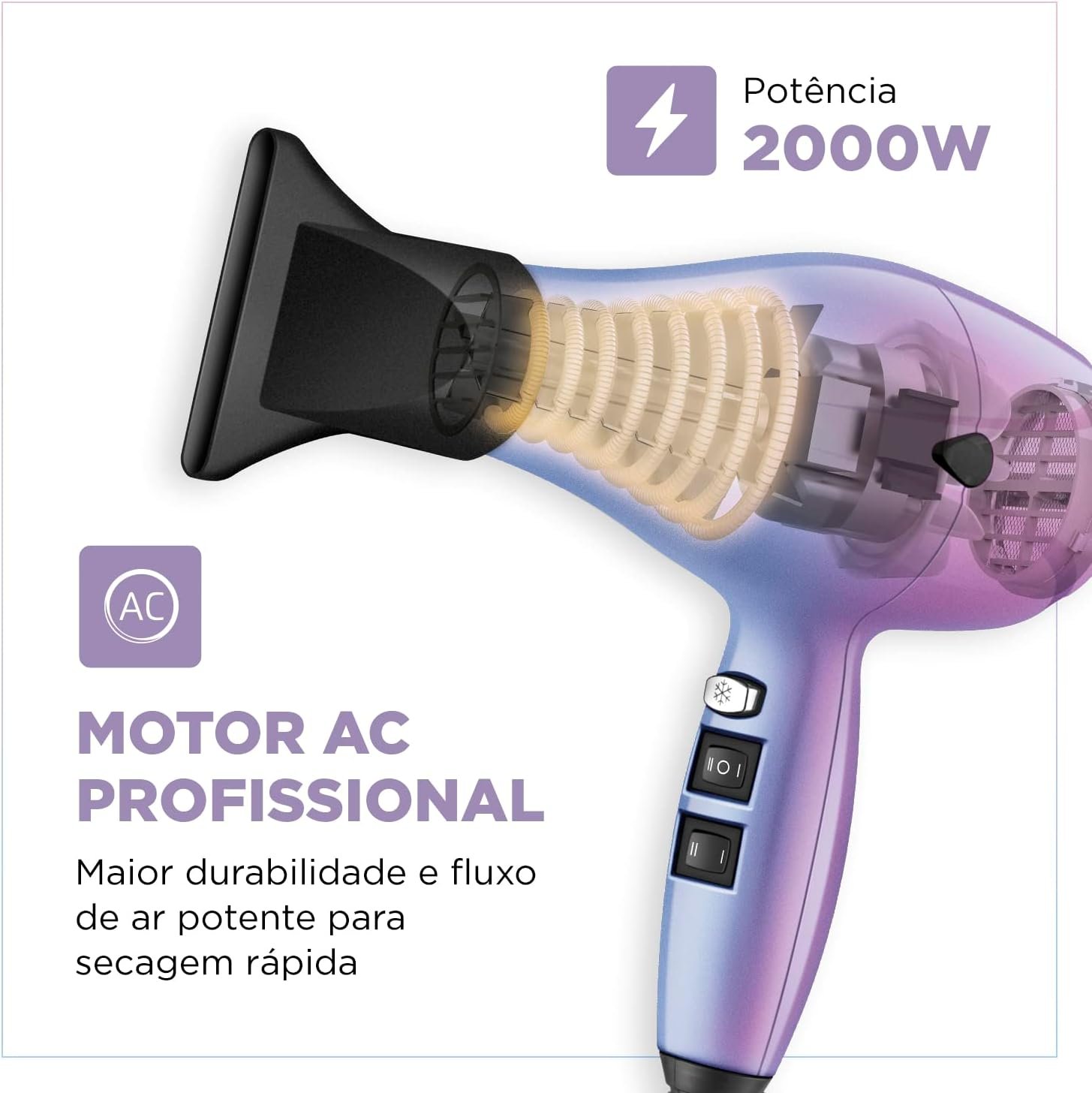 POTÊNCIA: 2000W: Alta potência para uma secagem rápida e eficiente.